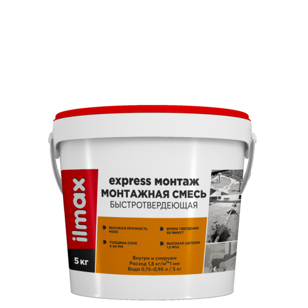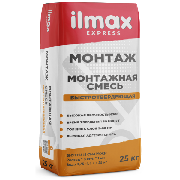ilmax express монтаж – безусадочная, быстротвердеющая смесь для монтажа различных элементов с толщиной слоя 5–80 мм (локально до 100 мм). Специальные цементы, тщательно подобранная фракция заполнителя, комплекс добавок обеспечивают стойкость к образованию трещин, высокую адгезию и прочность, а также морозостойкость.
