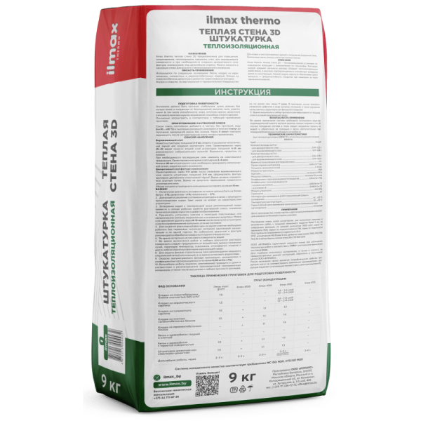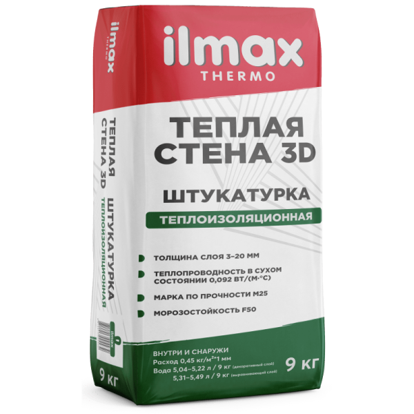 ilmax thermo тёплая стена 3D – теплоизоляционная штукатурка на смешанном вяжущем с заполнителем из стеклосфер. Благодаря низкой средней плотности раствор обладает теплоизолирующими свойствами, а высокая паропроницаемость способствует выведению влаги из конструкции. Низкий модуль упругости обеспечивает долговечность и трещиностойкость покрытия при нанесении на малопрочные основания.