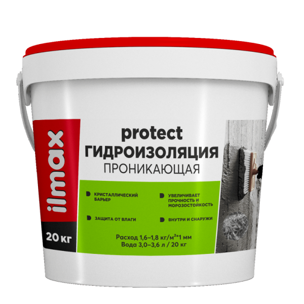 ilmax protect гидроизоляция проникающая предназначена для увеличения водонепроницаемости бетона конструкций, подверженных периодическому и постоянному воздействию воды (подвалы, цокольные этажи, фундаменты и др.). Наносить в несколько слоёв. Не является финишным покрытием. Для ручного нанесения.