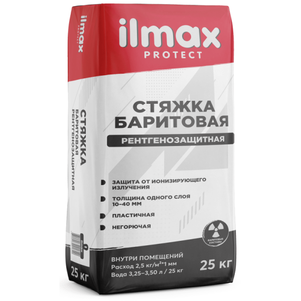 ilmax protect стяжка – рентгенозащитная стяжка на основе баритового концентрата КБ-3, цементного вяжущего и модифицирующих добавок обеспечивает защиту от ионизирующего излучения.